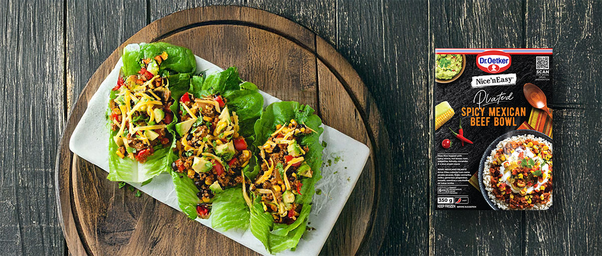 Separate the leaves of the baby gem lettuce, then spoon Dr. Oetker Nice 'n Easy Spicy Mexican Beef Bowl into the leaves. Crumble feta over the filled leaves.