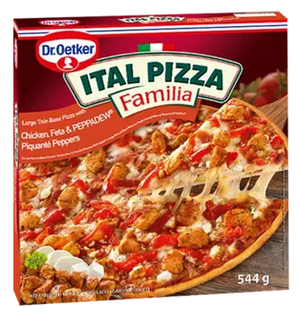 Pizza base (49%) (wheat flour (gluten), water, vegetable oil (canola seed), yeast, salt, sugar), tomato sauce (water, tomato paste, vegetable oil (canola seed), sugar, salt, thickener [E1422], dried garlic, herb and spice (irradiated), dried ginger (irradiated)), Mozzarella cheese (milk, salt, cheese cultures, non-animal rennet), cooked chicken (11%) (chicken breast meat, water, lemon juice, preservative (sodium metabisulphite [E223]), salt, sugar, thickener [E1422], vegetable oil (canola seed), dried ginger (irradiated), dried garlic, spices (irradiated)), Peppadew® piquanté peppers (6%) (sweet piquanté peppers, water, sugar, vinegar, salt, citric acid [E330], ascorbic acid [E300], firming agent [E509]), sweet and sour sauce (water, sugar, citric acid [E330], vinegar, tomato sauce (water, tomato paste, sugar, vinegar, salt, spices (irradiated)), soya sauce (water, soybeans (soya), wheat (gluten), salt), Feta cheese (4%) (milk, cheese cultures, non-animal rennet, salt), herbs (irradiated). CONTAINS: Wheat (gluten), cow’s milk, soya.